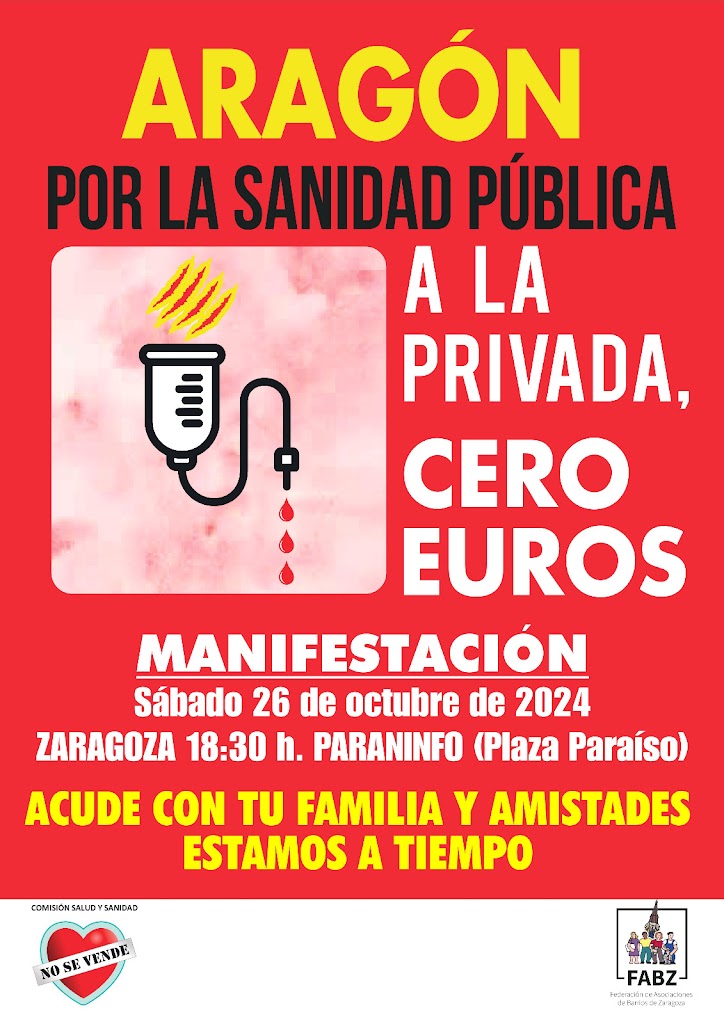 El Sindicato Obrero Aragonés apoya y participará en la manifestación convocada por la Federación de Asociaciones de Barrios de Zaragoza (FABZ) y la Asociación en Defensa de la Sanidad Pública en Aragón (ADSPA), ante la situación crítica del sistema sanitario aragonés, especialmente en Atención Primaria.