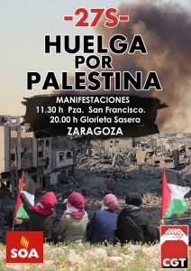 Alberto Gamarra, secretario de acción sindical de CGT-Aragón, ha explicado los motivos de la convocatoria legal: “por la redistribución del gasto público en favor de los trabajadores/as contra el auge de la inversión pública en partidas de defensa y militares y por el aumento de la inversión pública en medidas prestacionales para la clase trabajadora en el marco de la participación del Estado español en los acuerdos comerciales y de cooperación científica y tecnológica con fines militares con el Estado de Israel”. Tanto la Confederación General del Trabajo (CGT) como la Confederación Sindical Solidaridad Obrera han convocado a nivel estatal una huelga en todos sectores el 27 de septiembre de 24 horas a la que se han adherido cientos de colectivos y organizaciones.